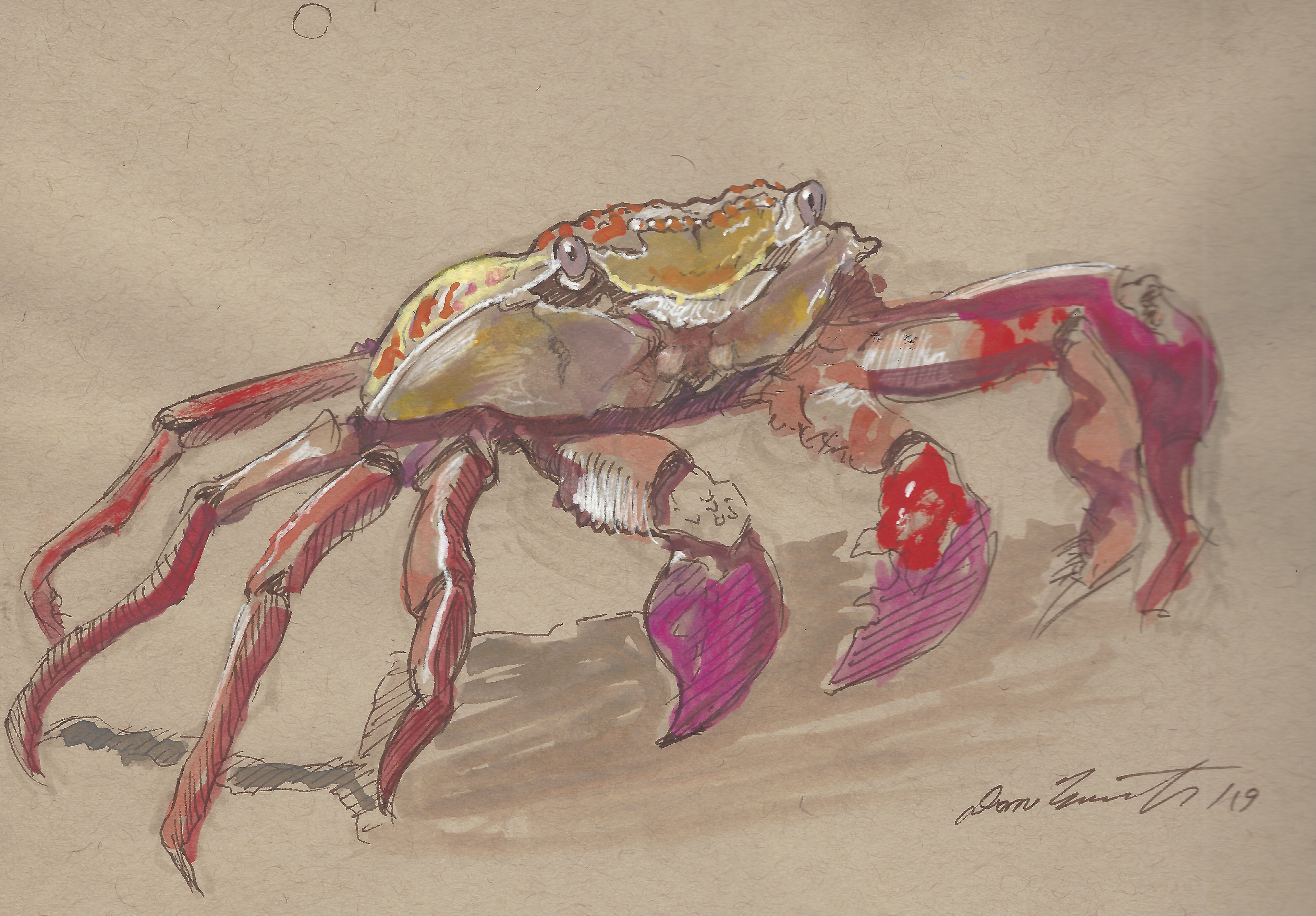 A gouache, chalk and ink sketch of the Sally Crab on toned Strathmore paper.